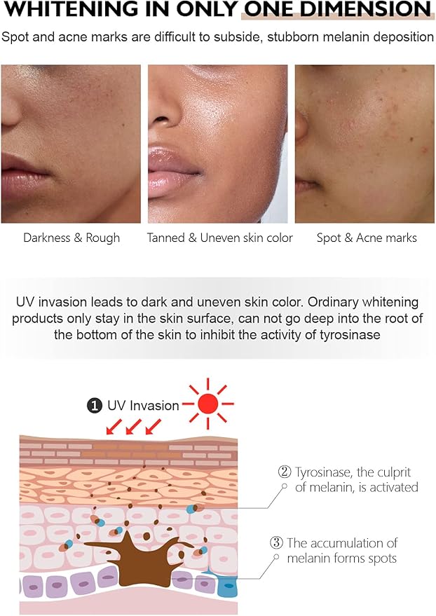 Yaraynta dhibcaha madow (dark spots), raadadka finan (post acne marks), iyo midabka maqaarka oo aan sinnayn.